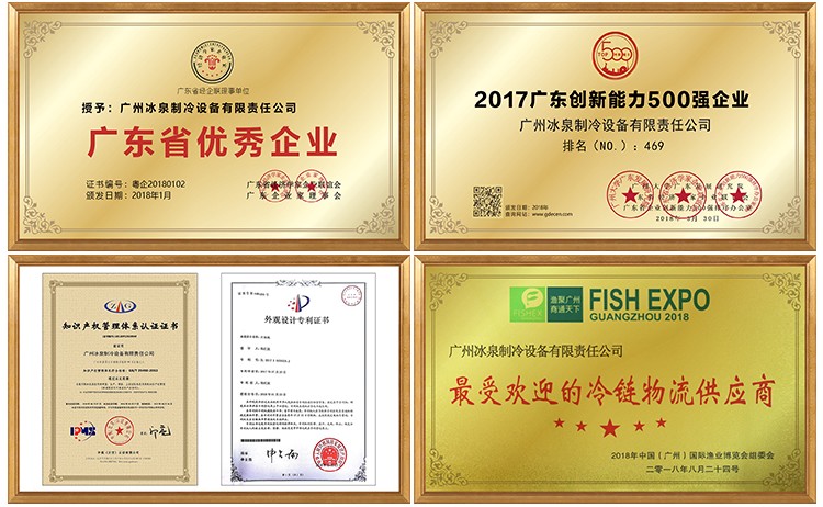 被評為“廣東省優(yōu)秀企業(yè)”; 入選“廣東企業(yè)創(chuàng)新能力500強”,制冰設(shè)備行業(yè)唯一一家; 通過國家“知識產(chǎn)權(quán)管理體系”認證; 被中國(廣州) 國際漁業(yè)博覽會評為“最受歡迎的冷鏈物流供應(yīng)商”