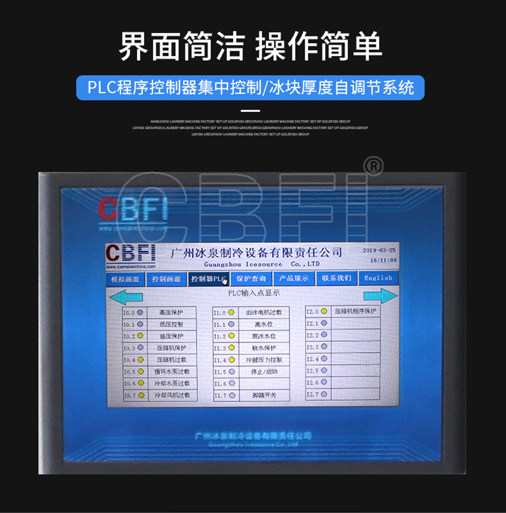 3、自動(dòng)運(yùn)行:采用PLC集中控制,冰塊厚度自動(dòng)調(diào)節(jié),自動(dòng)成冰、脫冰、補(bǔ)水,全自動(dòng)化生產(chǎn),無(wú)需人工調(diào)節(jié);