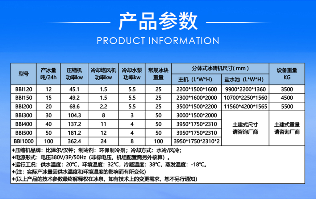 廣州冰泉是大型氟制冷冰磚機(jī)行業(yè)開(kāi)拓者,研發(fā)制造的全球第一臺(tái)日產(chǎn)冰量100噸的大型氟制冷冰磚機(jī)2010年在馬來(lái)西亞成功運(yùn)行。現(xiàn)單臺(tái)(套)設(shè)備日產(chǎn)冰量從1噸~200噸,可以滿(mǎn)足不同客戶(hù)需求。