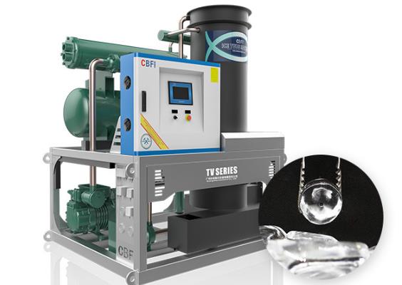 5噸管冰機采用水冷方式,適合大產(chǎn)量需求,如日產(chǎn)量可達5噸。水冷系統(tǒng)因其高效散熱,在高溫環(huán)境下比風(fēng)冷更為有效,耗電量相對較低,每噸冰耗電約70KWH。