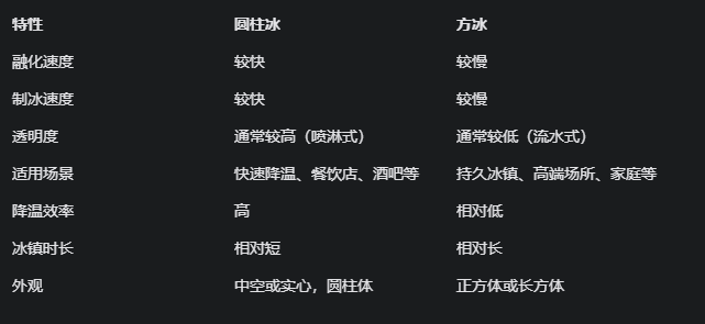 其實,圓柱冰和方冰沒有誰好誰壞,就看你用在哪兒,需要啥樣的效果了。為了更直觀的展示,咱直接上表格: