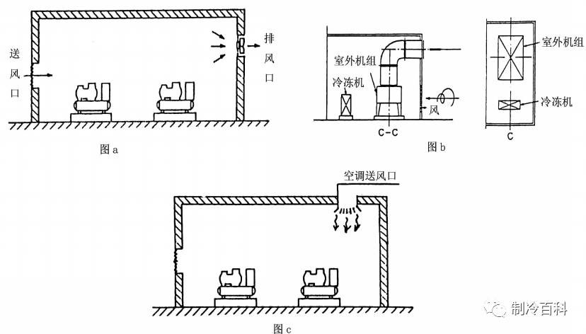 為防止冷凍機組排熱氣體滯留,機房需設置換氣裝置。換氣扇直接面向門或窗;換氣口面積是門(或窗)的內(nèi)部尺寸有效面積;機械換氣裝置原則上作為排氣裝置,必須保證所需的排氣容量。