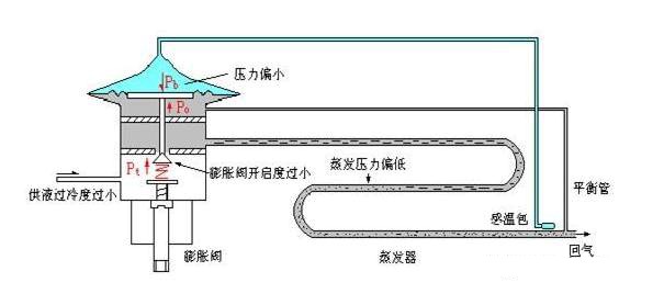 按照這一定律,如果膨脹閥出口壓力過低,相應(yīng)的蒸發(fā)壓力和溫度也過低。但由于進入蒸發(fā)器流量的減少,壓力的降低,造成蒸發(fā)速度減慢,單位容積(時間)制冷量下降,制冷效率降低。