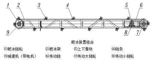 由鋼架、傳動(dòng)鏈條、傳動(dòng)鏈輪、減速機(jī)和滑塊等部件組成,驅(qū)動(dòng)裝置的電機(jī)功率為4KW。片冰機(jī)運(yùn)行期間,耙冰機(jī)反向旋轉(zhuǎn),將落下片冰儲(chǔ)冰室內(nèi)水平攤鋪;在儲(chǔ)冰庫出冰循環(huán)過程中,耙冰機(jī)反向旋轉(zhuǎn),將片冰耙進(jìn)檔冰板下方的水平輸送螺旋機(jī)。耙冰機(jī)的高度由升降裝置調(diào)整并固定。