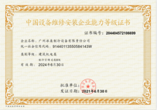 好消息!冰泉制冷又順利獲得了由中國設(shè)備管理協(xié)會聯(lián)合相關(guān)行業(yè)協(xié)會頒發(fā)的中國設(shè)備維修安裝企業(yè)能力等級證書(建筑機電類)。