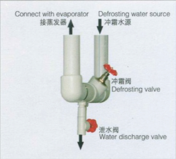 1)融霜結(jié)束后,關(guān)閉沖霜水閥,打開泄水閥 (見左圖);