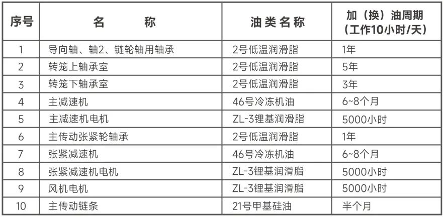 · 日常維護(hù)與保養(yǎng)的項(xiàng)目,特別是減速機(jī)和電動(dòng)機(jī)的維護(hù)與保養(yǎng),請(qǐng)認(rèn)真參照設(shè)備說(shuō)明書(shū)執(zhí)行。