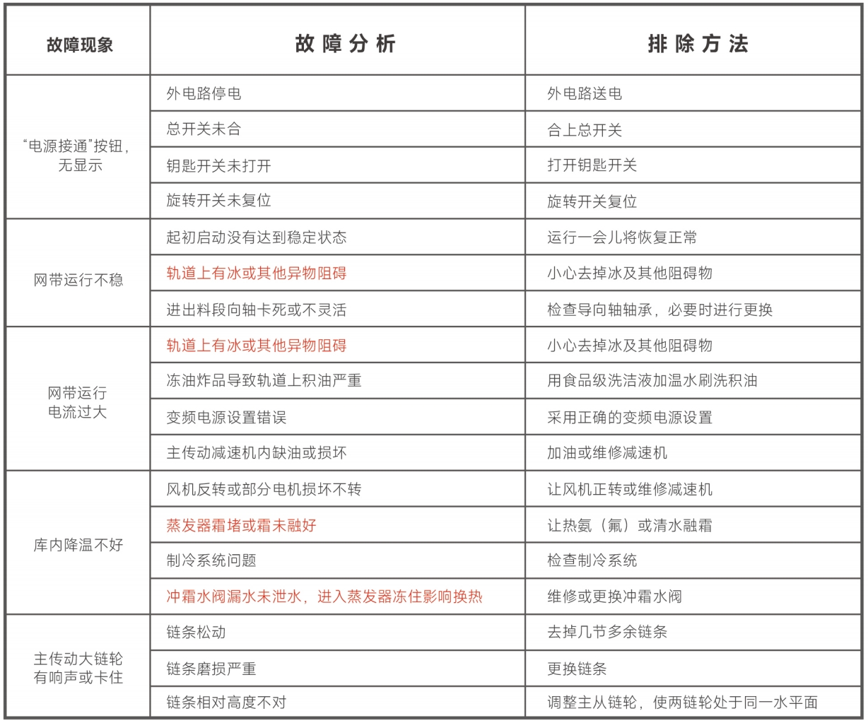 4.禁止當(dāng)日工作結(jié)束或中途停機(jī)吃飯,保住庫(kù)溫,稍后或次日繼續(xù)使用,會(huì)導(dǎo)致網(wǎng)帶凍住,造成傳動(dòng)電機(jī)電流增大和拉傷網(wǎng)帶事故。